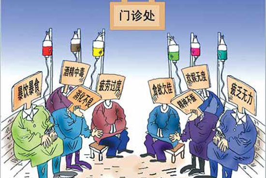 假日綜合征反映在身體上的疾病,主要有酒精中毒、胰腺炎、消化不良、膽囊炎、冠心病、高血壓等等。四川省人民醫院營養科主任楊詠濤說,這些都是跟營養代謝息息相關的。根據以往的經驗,節后,門診上出現這類患者的現象十分常見。