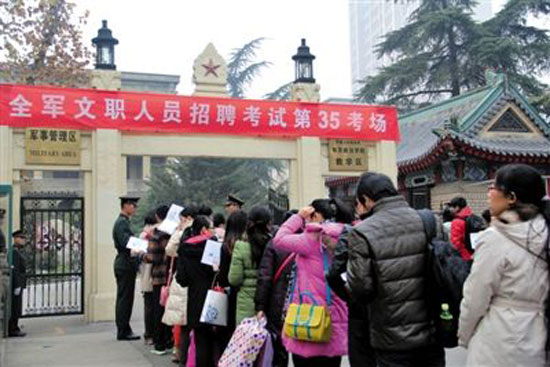 12月15日,在解放軍南京政治學院考點,考生等候進場參加考試。當日,軍隊首次統一招聘文職人員考試舉行,據解放軍總政治部有關部門介紹,共有10萬余人報名應聘,報名和錄取比例平均為38∶1。